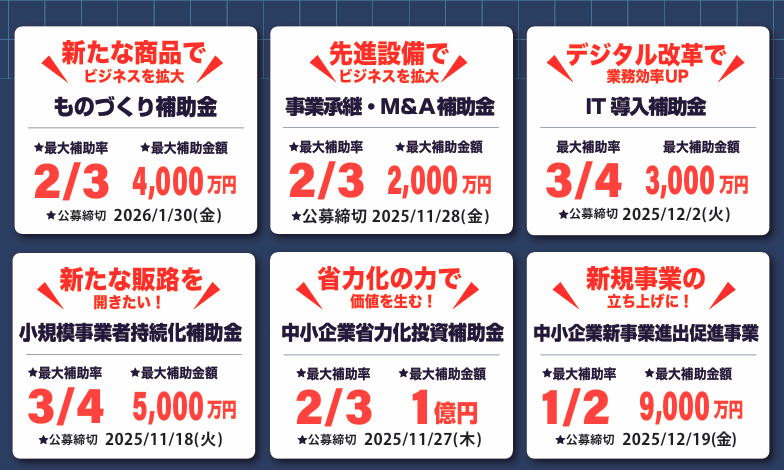 2025年度の各種補助金について、最新の公募締切情報を更新しました。